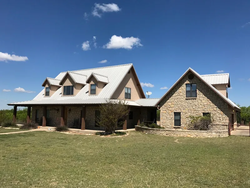 3 bed 2.5 bath 2 story rock home built in 2005 has exquisite details with textured walls & stained concrete floors. Eat-in kitchen with island opens to the living room, but there's also a formal dining room with lg bay windows. Living room has a vaulted ceiling, a corner fireplace & sitting room with a view of the back yard. Master suite has French doors opening onto a patio. Guest rooms are upstairs & also have walk-in closets. 2-car garage has a studio style apartment upstairs with a shower, living area & kitchenette. 4 stall carport with a storm shelter has telephone & electricity. 4.5 stock ponds on property & a seasonal creek. Approx 30 acres of cultivation N & E of the home & remainder is native pasture.