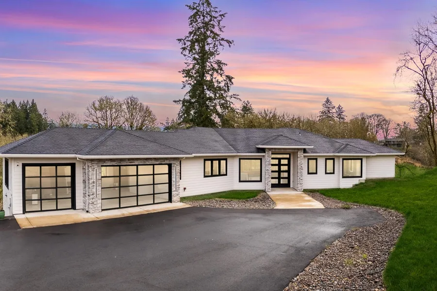 Discover this stunning 2022 custom built contemporary acreage estate, perfectly situated on 2.25 serene acres in the heart of Oregon's Wine Country. Surrounded by pastoral beauty and the gentle sounds of Chehalem Creek, this gorgeous property offers a rare blend of privacy and sophistication, with picturesque views that include grazing horses in the backdrop. Designed for both comfort and style, this 3,442 sqft home boasts soaring 10 and 12-foot ceilings, a main-level primary suite with a private balcony, three additional bedrooms, a dedicated office, and a spacious lower-level family room. Thoughtfully selected contemporary finishes include quartz countertops, luxury vinyl flooring, designer lighting, an entertainer's wet bar, integrated smart home features and a whole home water filtration system. Step outside to a covered deck, where a striking stone gas fireplace invites year-round e...