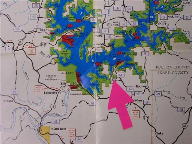 UNBELIEVABLE SETTING. 3 BR, 2 BA, open living area with stone fireplace, vaulted ceiling. 12.11 acres m/l joining the government strip. City water and well, 30X60 4 car garage (with workshop area). Only 5 minutes from Jordan, Lake Norfork, teeming with deer and turkey. $199,500