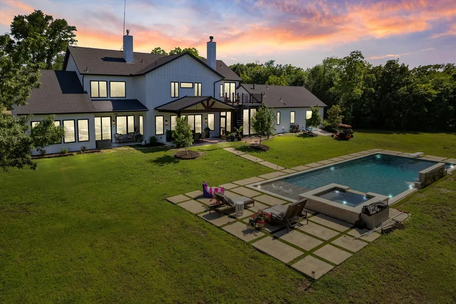 Welcome to your dream retreat on over 12 breathtaking acres of trees, prairie, and creekside serenity. This custom-designed estate is packed with luxury, functionality, and self-sufficiency; perfect for modern living in a peaceful country setting. Inside, you'll find custom engineered hardwood floors, no carpet anywhere, and natural stone countertops throughout. The chef's kitchen is a showstopper, featuring a 6-burner Thermador range with brass pot filler, pro-grade stainless appliances, built-in fridge, wine fridge, custom cabinetry with hidden coffee bar, and an automatic touch faucet. The primary suite is your personal spa oasis with a massive walk-in closet, island cabinetry, a cast iron tub, infrared sauna, and a commercial-grade steam shower with dual benches, rain heads, and handhelds. Every bedroom includes walk-in closets and ensuite baths with stone counters, mosaic tile, and glass showers. Enjoy five stunning porches-including a screened-in with fireplace, a private master patio, and a spiral staircase leading to a rooftop deck with panoramic views. Need space to work? A private modern office with see-through fireplace connects seamlessly to the living area. Entertainment-ready, this home is fully prewired for AV and security, with installed surround sound in the living room and upstairs bonus room. Step outside to your own resort: a 52-ft diving pool with 9.5-ft deep end, 7-person spa, lush landscaping, and four irrigated garden beds. Water security is unmatched with a refurbished well, 9,000-gallon rainwater tanks, full home purification system, and a $20K Generac whole-home generator. Ag-exemption eligible and move-in ready, this property delivers luxury without compromise.
