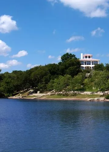 With over 1,000 feet of waterfront, this 12.5-acre secluded peninsula near the confluence of the Pedernales River and Lake Travis epitomizes the best the Hill Country. The 6,000±-square-foot, five-bedroom, five-bath, two-den vintage Mediterranean estate boasts hardwood floors throughout, floor-to-ceiling windows, and a wraparound balcony overlooking the property. Ornate tile work, distinctive window treatments and hardwood ceilings are only a few of the unique touches to the home. An extensive stone pathway leads to a barn, a 1,200-square-foot private guesthouse, a secluded patio and a large covered dock featuring ample deck space and a boat house for entertaining on the water. This ranch lies only 30 minutes from Austin.