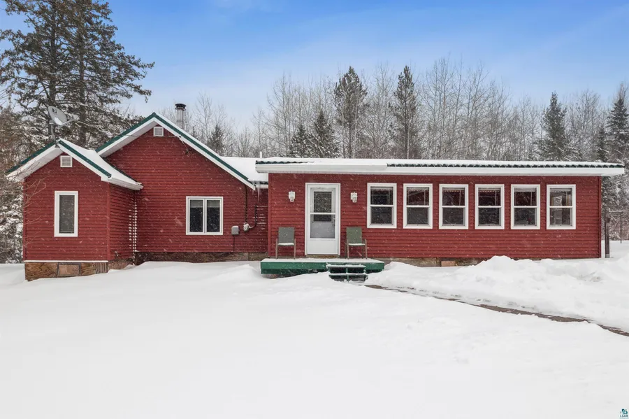 Great opportunity for one-level living set on 12 wooded acres! Be greeted by a 29'x11' heated porch; this wide-open space has a fun red-and-white color scheme and welcoming fireplace. The living room, dining area, and kitchen are combined for an open layout. Living room has wood-beamed ceilings, quality fabric-covered walls, cozy wood stove that is able to heat entire home. The kitchen has a walk-in pantry, efficient layout for meal prep, and newer appliances inc. a gas stove. The dining room has access to composite deck where you can enjoy coffee, grill dinner, view the wildlife in the rock fountain pond, or relax in the hot tub. A bonus room, currently used for winemaking, can be an extra pantry or office space. The 3 bedrooms are conveniently located near an updated 10'x7' full bathroom and laundry room. Home has tankless on-demand water heater, steel roof, and central air. UPDATES: Walsh patio door, Walsh windows throughout, composite deck/railings, Walsh vinyl siding. OUTSTANDING OUTBUILDINGS: *36'x40' GARAGE: recently built w/12'8" high ceilings, 3-stall w/loft, separate electric, and seamed-slab foundation w/curbs, w/a 12'x35' concrete slab next to garage; could be used to park RV or as a foundation for an addt'l outbuilding. *30'x50' POLE BUILDING: concrete and dirt foundation, huge loft, sliding door/main door, trolley beam, work area, 200 AMPs, and room to store boats/tractors. *15'x19' SHED: heater unit is present, insulated, on slab, w/lean-to on back of shed. Outside, discover small creeks, apple/crabapple trees, and an abundance of wildlife. Location allows for easy commute to Duluth/Superior and warmer weather away from the lake. Throughout property, it is evident every inch of the home, land, and outbuildings have been loved and cared for; it is time for a new owner, will you be the one lucky enough to call this house your new home?