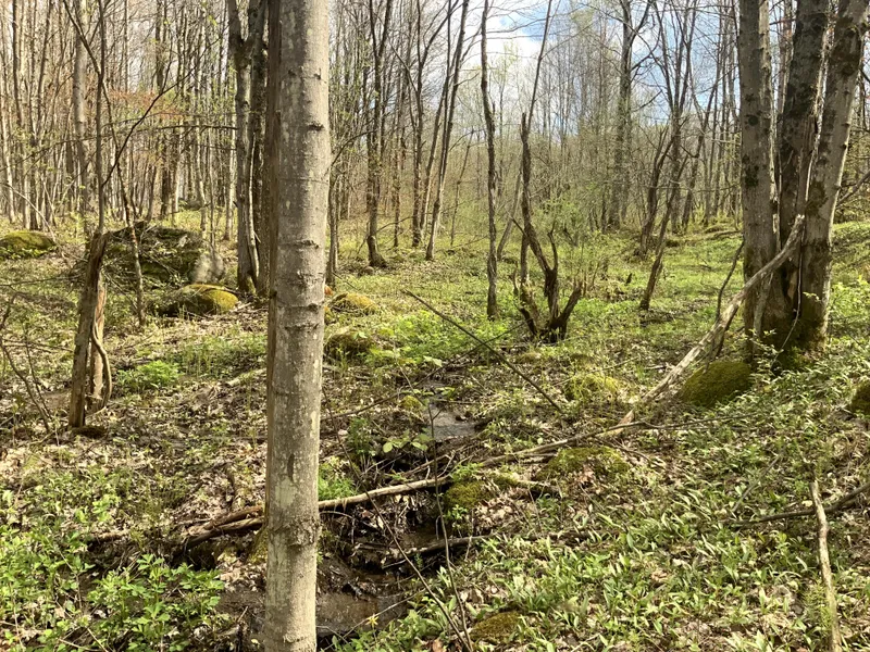 12 acres of mixed woodlands featuring rolling hardwood knolls ideal for building a camp, small creek running through the property with some open clearings. Acreage is perfect for the elevated building site overlooking a slight downhill watch for deer, bear, turkey, grouse and all woodland wildlife! Directly borders State Lands!