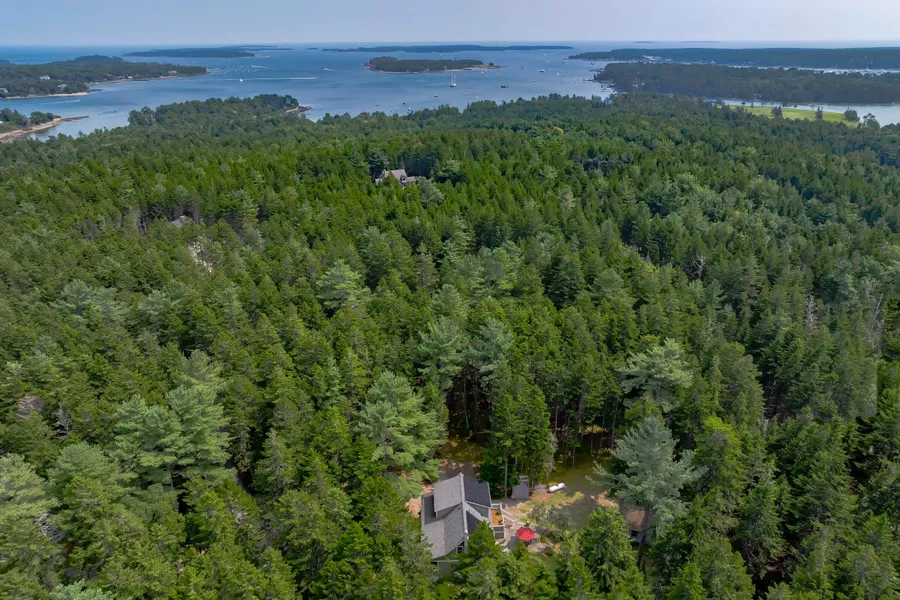 On 1.28 private acres down a pretty, tree-lined drive, this beautiful, custom-built 1,440 +/- sqft. cedar shingle, clapboard cape has three bedrooms & three full baths. The Douglas Fir porch wraps around three sides of the house with two separate entrances, and a main front door leads into a bright living/dining area with oak floors and a wood stove, plus an electric heat/a/c pump. A counter bar flows into the kitchen with radiant heat, granite counters, custom cabinets, and a gas stove, as well as a pantry with custom shelves. The first-floor bedroom or office has custom built-in shelves and a closet with built-ins. There is a full bath across the hall with radiant heat and a linen closet, and an additional entrance from the porch with a coat closet.Stairs to the second-floor lead to the spacious primary suite with views on three sides, a ceiling fan, and a window seat next to the walk-...