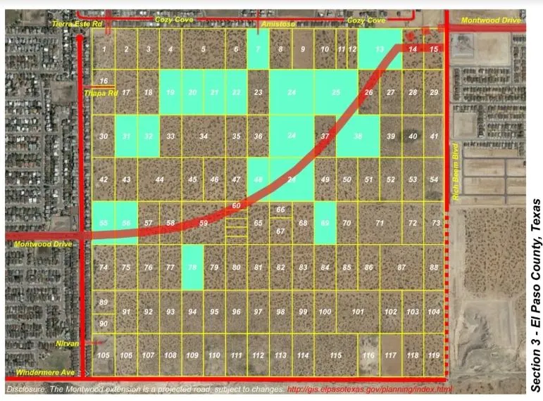 Montwood Drive is one of the most important streets in El Paso, Texas. It runs parallel to Montana Avenue and Interstate 10. Today, Montwood Drive ends at the western portion of this land and continues at the north-eastern portion of this section, which is the corner of Rich Beam and Montwood Drive. In the 1970's Section 3 was sold in 5 acre tracts and it was very difficult to acquire all the different parcels to continue the street. The same thing goes for Tierra Este Drive that currently ends on the northern portion of Section 3. If this land is developed it will greatly benefit east El Paso with the traffic flow and it will create numerous commercial and apartment opportunities as well as residential neighborhood with great access that will skip some of the traffic problem areas. This would be a very desirable residential development because of the proximity to I-10. We also have a second portfolio of properties with 100+ acres in this Section of land. Please see attachment for parcels and appraisal report.