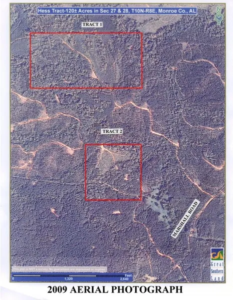 51-005 Buena Vista Timber Tracts - This listing features two non-contiguous tracts of +/-40 acres and +/-80 acres located 1/4 mile apart, and which are located just north of the historic north Monroe County town of Buena Vista. The property is accessed off Marshall Road as noted on the accompanying maps. The north tract, designated as Tract 1, consists of +/-80 acres, with all of it timbered except for one game plot and the woods roads. Tract 2, located 1/4 mile to the south is also completely timbered except for a game plot, roads, and a rustic cabin on the north side. As noted on the plat and topographic/stand maps, and the aerial photograph and on-site photographs, this property features excellent loblolly pine timber, varying from mature natural timber and plantations, to younger premerchantable plantations. There is also hardwood timber located in the drains.  The enclosed stand map lists the approximate acreages in each of the timber components. Based on updated timber cruise data, the property contains the following volumes of timber: Pine Pulpwood - 1,755 tons; Pine C-N-S - 522 tons; Pine Sawtimber - 772 tons; Small Pine Poles - 89 tons; Spruce Sawtimber - 58 tons; Hardwood Pulpwood - 1,054 tons; Hardwood Sawtimber - 27 MBF. These volumes are considered to be accurate, but are not guaranteed by Seller or Broker. In addition the merchantable timber,  there are approximately 34 acres of premerchantable pine plantations. These are excellent timber growing and hunting tracts located in a very desirable location.  Access is by prescriptive easement through the adjoining landowner. The property is being offered as a whole for the price noted, but separate offers will be considered for each of the tracts. Please contact Don Donald at the Camden Office at 334-682-9825 or 866-788-0759 for more information or for an appointment to see.