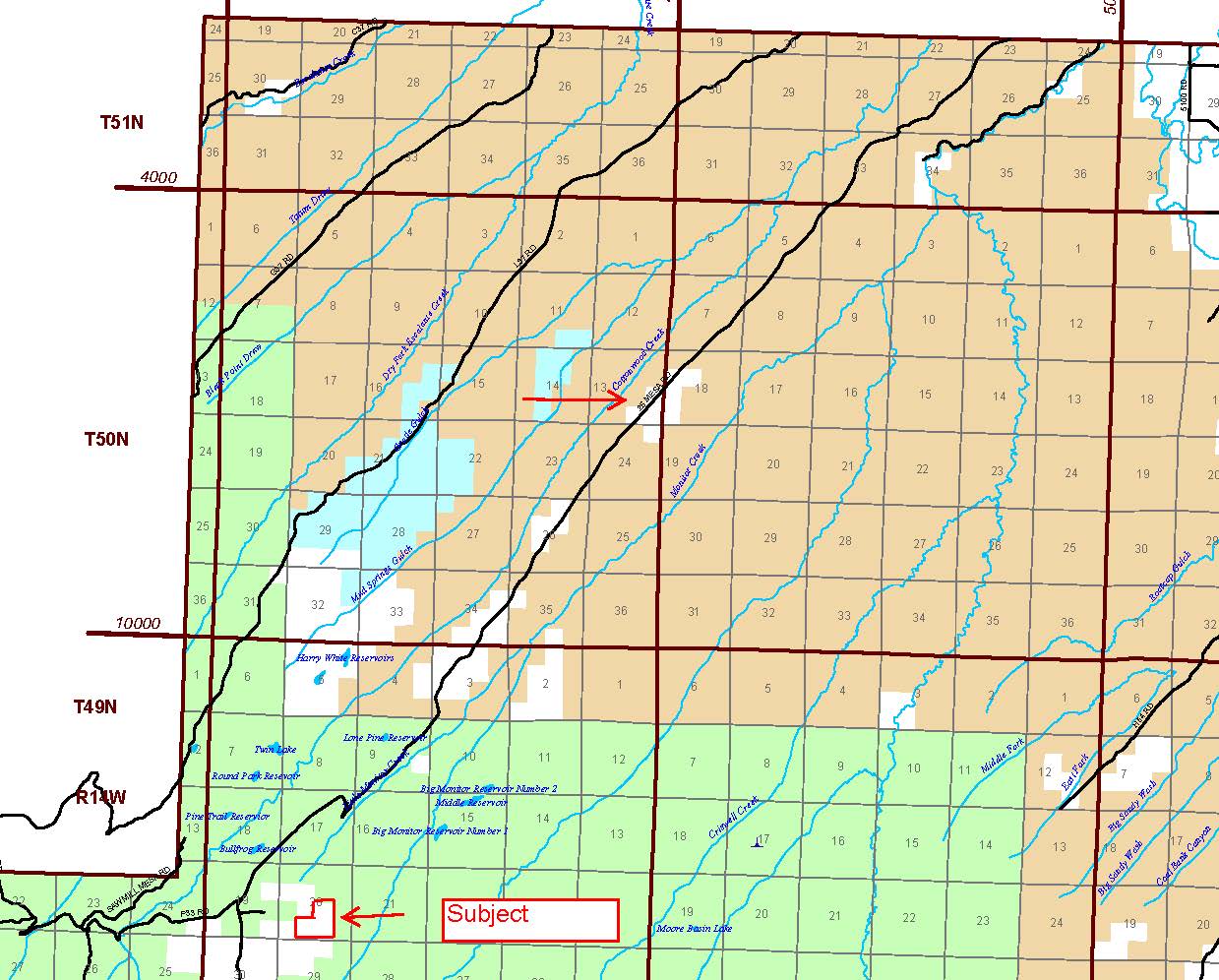 chokecherries, sarviceberry and sage. There is a spring and a few ponds. 3 permitted wells.