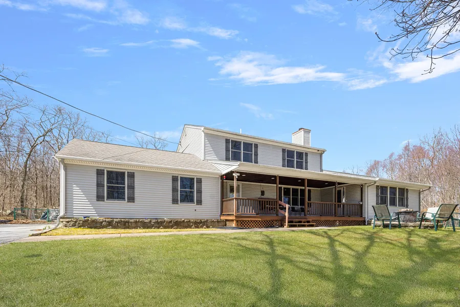 Welcome to this stately colonial, situated on 2.26 peaceful acres off Old Mountain Trail in Richmond. A stone wall entrance and winding driveway set the tone for this impressive 3,000+ square foot home, where elegant design meets comfortable living. The heart of the main level features a well-appointed kitchen with granite countertops and stainless-steel appliances that flows into formal dining and an intimate sitting area. Here, you'll find a zero-clearance fireplace with built in Waterford Wood Stove surrounded by built-in bookcases. The expansive living area steals the show with its cathedral ceilings, skylights, cozy pellet stove, and convenient wet bar. A separate wing with private entrance offers perfect in-law suite potential while maintaining connection to the main home. Upstairs, two bedrooms share an oversized full bathroom, while the primary suite provides a private retreat with its own bathroom and balcony overlooking the serene grounds. The outdoor space is truly special - featuring a large wood deck accessible from multiple rooms, an inviting in-ground saltwater pool, a custom-built brick cooking area for outdoor grilling, and a covered farmer's porch perfect for morning coffee. The private fenced backyard, complete with a soothing water feature, irrigation system, beautiful plantings, and borders open space - ensuring your piece of tranquility for years to come.