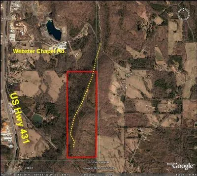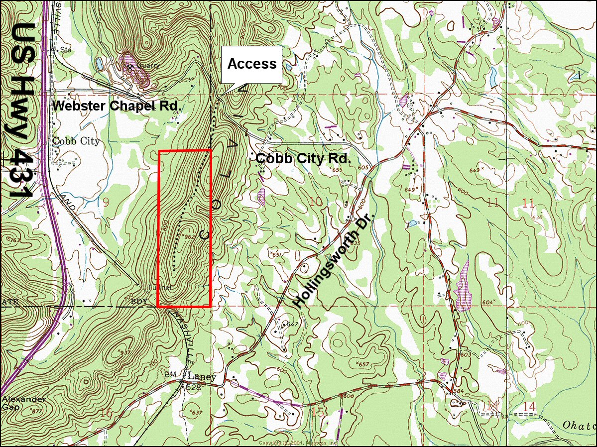 Research Parcel InformationFrom Interstate 20, take Anniston Exit (US Hwy 431 North) and go north through Anniston on Quintard Ave. Go 6 miles to split of US 431 and AL Hwy 21, and bear left staying on US 431. Go 17½ miles crossing into Etowah County to the intersection of Webster Chapel Rd on the right. Take a right on Webster Chapel Rd and go 1 mile to the top of the hill and a dirt road on the right with a white gate (gate stays open). Take a right and go about 350 yards to the northeast corner of the property.