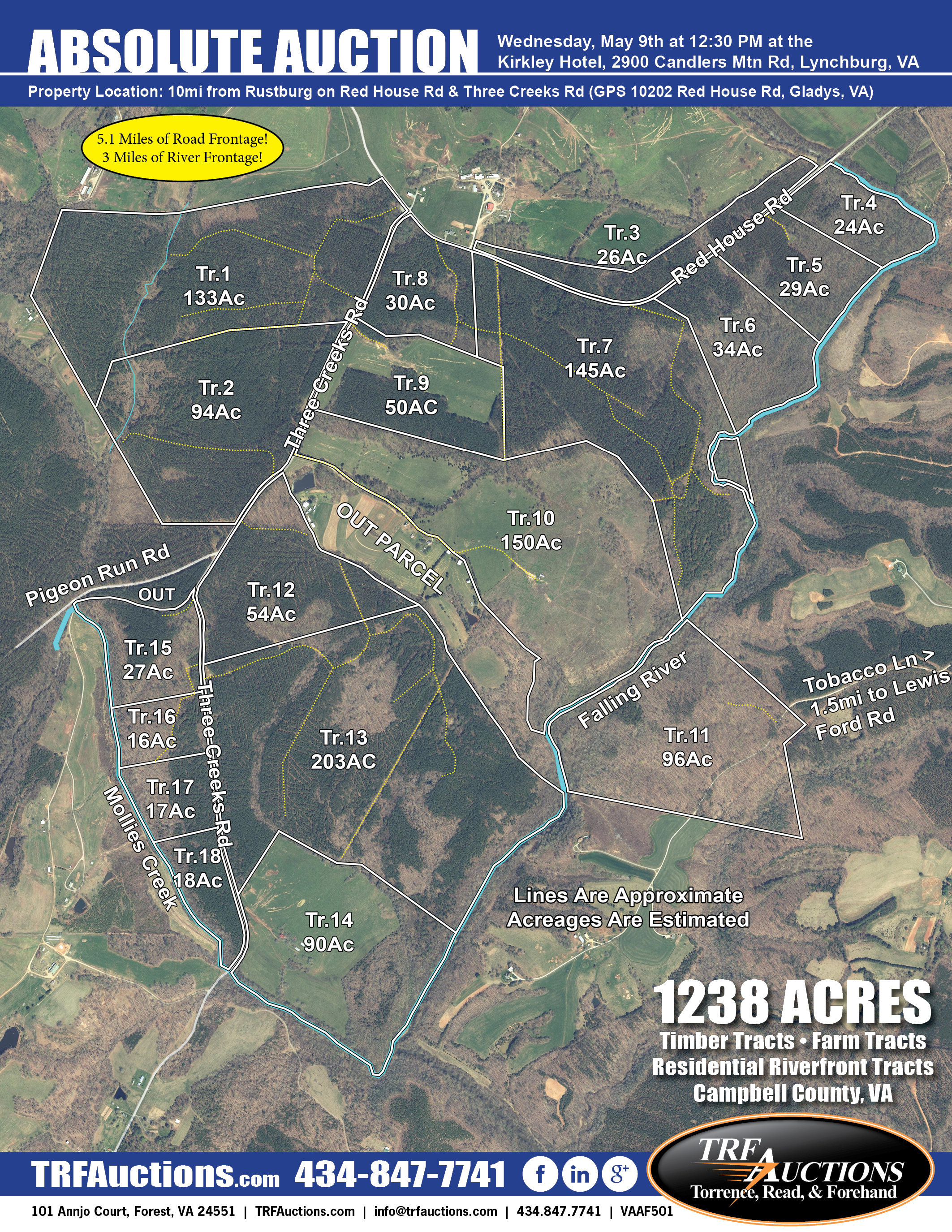 Selling absolute to the highest bidder(s). Rare opportunity in Campbell County for a large acreage tract. Offered in 18 tracts with something for everybody! The majority of the 1238 acres is in managed timber with 5.1 miles of paved road frontage and 3 miles of scenic river frontage on Falling River. There is also long frontage on Mollies Creek and many interior streams plus roads and trails throughout the property.