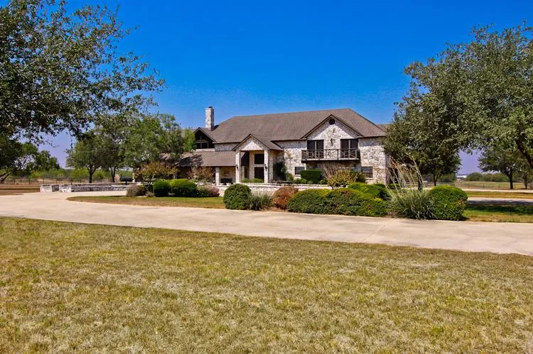 124 acre Hilltop Ranch. Country living with community convenience. This ranch is high fenced on three sides, has a paved drive, 2 large stock ponds, a 2,400 sq ft barn, and a Carrizo Well. There is also a beautiful 4,893 sq ft rock exterior 4 bed 5 bath lodge built with privacy in mind. Each of the upstairs bedrooms has on-suite full baths and private balconies while downstairs is open and great for entertaining with a large living area, open kitchen, game room, and dinning area that overlooks the lake.