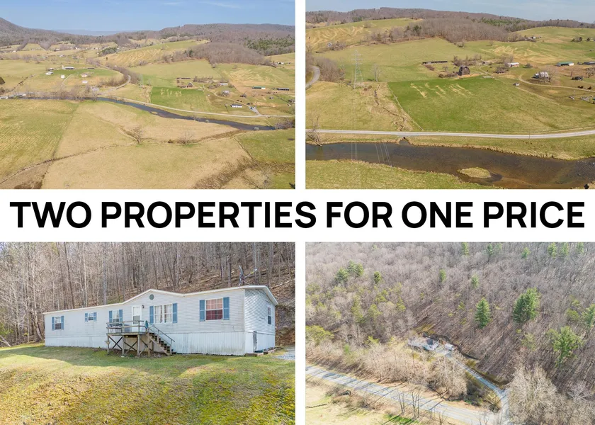 Opportunity knocks! Two properties for one money! First property is a +/-47 acre farm in the country with amazing views, bold creek frontage, property on both sides of the creek, mostly flat usable land, barn, equipment shed, fenced, and all equipment conveys! Other property located only about 4 miles away is a little over 2 acres, has a 1995 double wide, private well and septic, and outbuilding. Would make a perfect residence while you build on the farm or potential rental income. Properties DO NOT ADJOIN and are listed as one listing per the seller's request. Both properties are to be sold together.