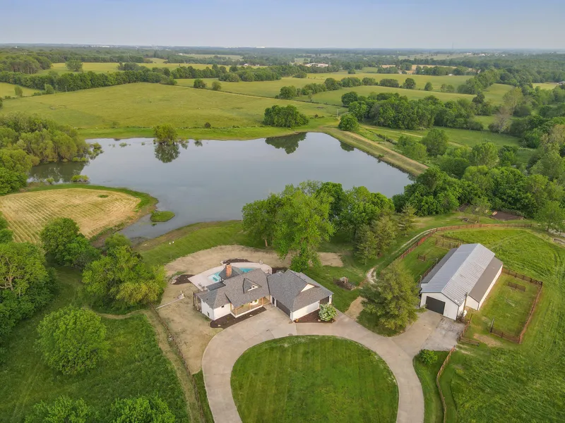 A stunning combination of features in this luxury listing that boasts 130 ACRES! The renovated primary home has been exquisitely executed. Each design choice has been hand-selected and is complimentary to the overall cohesive design. A gated entry and long paved drive offer both privacy and a gorgeous setting for the home. A few property features: inground pool, lake with dock, massive shop, 3 story stone barn (event venue quality), spring house, high speed internet AND a 2,000+ sq. ft. secondary home! The main home welcomes you with a covered front porch and custom double doors. Upon entry you see a bank of windows and doors that offer stunning views of the property. Living room features hardwood flooring, stone fireplace with gas insert and a soaring ceiling. The kitchen is state-of-the-art with luxury tiered stainless steel appliances such as GE Monogram ovens, gas stovetop, Jenn Aire Refrigerator, custom cabinetry rich with features like built-in utensil and knife storage, quartz solid surface countertops, open shelving and incredible tile that brings the perfect amount of texture and warmth. Off the kitchen you will find entertainment-rich stations. Including: built-in Thermador coffee machine, dishwasher drawers, beverage cooler, nugget ice machine, sink that offers chilled, filtered AND sparkling water. Within this space you will also find an additional prep sink, refrigeration system that holds sheet trays for your outdoor grilling events or perfect to chill Hors d' oeuvres and appetizers. Convenient access to the expansive back deck overlooking the pool and lake. A dream space to entertain in. No details were overlooked. The primary wing offers dual BATHROOMS. Not separate vanities but bathrooms! They are separated by a huge walk-in closet with built-in features and its own laundry station! The design allows each bathroom to make a statement. Whether you choose the one with the massive walk-in shower or the true art piece of the standalone air tub + walk- in shower with a view, you simply cannot go wrong. The wing offers two access points to the deck.