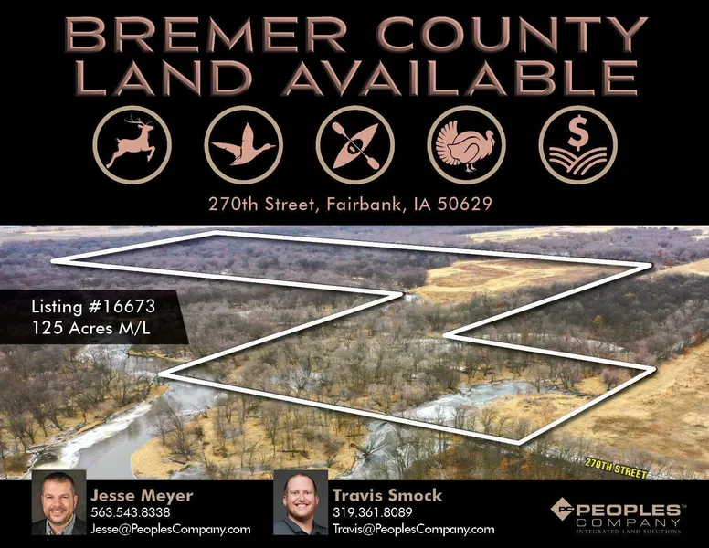 Peoples Company is pleased to present a 125 acre m/l riverfront, recreational farm located northwest of Fairbank in Bremer County, Iowa. This farm is set up to grow and hold wildlife including whitetail deer with a perfect mix of mature timber and CRP for cover and water provided by the Wapsipinicon River. There are 28.23 FSA Cropland acres carrying a CSR2 of 52.8 that are currently enrolled in the CP23 CRP program. The CRP contract pays $343.05 per acre or $9,684.30 annually and expires in 2024. The property feels even larger than its size with Bremer County's 166 acre m/l Seven bridges Wildlife Area along the west border and Iowa DNR's 1,428 acre Aldo Leopold Wildlife Area along the north border. The open CRP field is conveniently surrounded by timberland, creating an ideal wildlife bedding area for whitetail deer, turkey, and pheasants, and features a large permanent hunting blind. In...