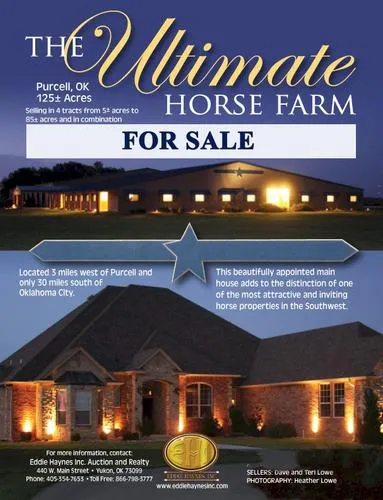 Located 3 miles west of Purcell and only 30 Miles south of Oklahoma City. 125 (mol) acres will sell in 4 tracts from 5 to 85 acres (mol). The beautifully appointed main house adds to the distinction of one of the most attractive and inviting horse properties in the Southwest! The main barn has 30 stalls, tack, feed, wash rack, all the extras...The 118'x225' indoor arena is complimented by a 125'x250' enclosed barn with adjoining shelter fro the 60' round pen and 60' 6 horse Trojan Wa...