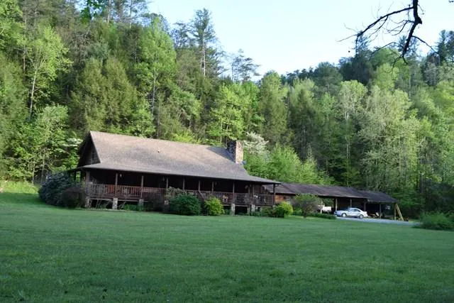 Log Home sitting in East Tennessee Valley of Sevier County on 125 acres with large flowing creek flowing through the front yard of this 3 bedroom 2 1/2 bath Ranch style home, hardwood flooring, stone fireplace, cathedral ceiling, pine tongue and groove interior walls. Wrap around porch to relax while enjoying the peaceful country style living. Equipment shed, barn with bunk house, riding trails throughout the mountains which surrounds this secluded home and acreage.