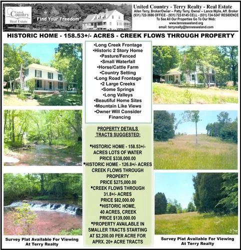 MOTIVATED SELLERS, PRICE REDUCED BY $78,000! NOW priced at $338,000.00 for all 158+ acres and home (LISTING#41099-20820). The historic home built in 1927 is said to a Sears and Roebuck home. It is 2 Stories with 2,088 square feet~ 1,464 square feet on the main floor and 624 square feet upstairs. The interior needs lots of work however. Board walls & ceilings in some rooms, wood floors, 3 bedrooms, 1 bath, good size dining room,sunroom & wrap around porch. New survey, the land is on both sides of a county gravel road not traveled much with an abundance of water flowing through! The house side features approximately 126 acres with Bowstring Branch flowing along the property line with waterfalls and some of the valleys have spring fed streams in them as well, nice spots to build ponds/lakes. It has rolling pasture, some of the land is also in cutover timberlands ready to easily clear off and plant in pasture or more trees, some not cut and a lot of fencing. Across the road Bowstring Branch flows through the remaining property and the property on that side is all fenced AND fronts also on another larger creek as well! Long road frontage, long creek frontages, beautiful farm. Seller is willing to divide as well. SUCH AS: THIS PARTICULAR LISTING # 41099-20821-For $275,000.00. The historic home with apx. 126.8+/- acres, all on one side of the road, lots of pasture, some in the cut over timberlands, fencing and rock bottom Bowstring Branch flows along the border with waterfalls and some valleys with spring fed streams coming out of them. Long creek frontage, long county road frontage. OR #41099-20822-For $139,000.00 Historical home on 40+/- aces with some of the creek, mostly in pastureland with some timber and some fencing. OR #41099-30823-For $82,000.00 31.8+/- mostly level acres across the road from the home, with Bowstring Branch flowing through AND a second larger creek as well along one of the borders! Fenced, with beautiful level pasture & electric available. Long road frontage and creek frontages. OR Will Divide into even smaller tracts as little as apx. 7 acres in one spot for $2,200.00 per acre, with short frontage on a small creek and road frontage on the county road. OR SUCH AS LISTING: # 41099-20824 Will divide into 20+ acre tracts along the beautiful Bowstring Branch Creek with solid rock bottom and waterfalls with privacy and seclusion for $2,200.00 per acre. Owner will consider some owner financing, he said make a reasonable offer of what you can do and we'll consider it and go from there and see if we can work something out....