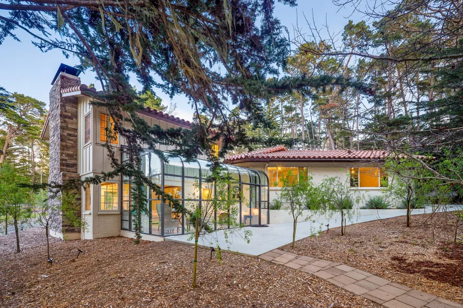 Designed by local Carmel architect, James G. Heisinger, discover the charm and character of this private Pebble Beach gated estate with a guest house, set on an amazing 1.3 park-like acres just 5 minutes from the Pebble Beach Lodge and iconic golf courses. Full of natural light, the main house and newly built guest house offer a total of four bedrooms and three baths. It is perfect for entertaining; it features an industrial Sub-Zero refrigerator, a Wolf dual-fuel range, quartz countertops, inviting spaces like a sunroom and library, plus two wood-burning fireplaces in the living room and the primary bedroom. The exterior has an enclosed courtyard with a fountain. Outdoor living offers multiple patios, two outdoor firepits, and serene garden settings. Located in the coveted Carmel School District and near Stevenson School, enjoy easy access to The Lodge at Pebble Beach, golf courses, bea...