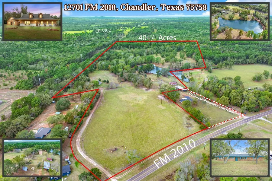 Multi-generational ranch opportunity in the highly sought after Chandler, TX! Discover ideal country living on this beautiful 41+- acre property, perfect for hunting, fishing, horses, cattle, and all your homestead desires. The property offers incredible amenities for both work and recreation featuring main home with detached office or workshop, guest home, 235x50 arena, barn, oversized covered parking, beautiful pond, rolling hills, scattered mature trees, and excellent FM road frontage. The charming 3-bedroom, 2.1-bath main farmhouse filled with natural woodwork that adds warmth and rustic elegance throughout. Every corner of this inviting and well-designed home blends comfort with timeless style, making it the perfect place to unwind and enjoy the peaceful surroundings. Enjoy the huge primary suite with jacuzzi tub and huge closet, and easy maintenance throughout with the stained concrete floors. Opportunity for multi-generational use, guests, rental income, or ranch hand use with the 4-3 guest house with bonus room or office with exterior access. The workshop next to the house provides an ideal space for projects, equipment storage, hobbies, or convert into an additional living. The large barn, arena, and lean to is well-suited for livestock or extra storage, making this property versatile for agricultural pursuits. A picturesque pond adds to the lands natural beauty, creating a serene setting for fishing, picnics, or simply relaxing by the water. Embrace the best of rural living with this remarkable farmhouse with rolling hills and scattered mature trees and woods in the back great for hunting huge bucks and local wildlife.