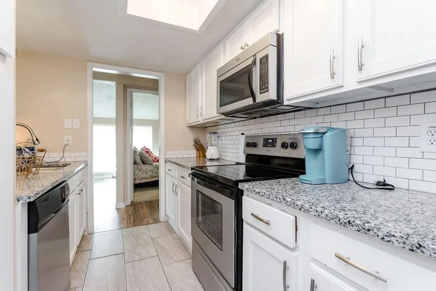 Delightfully Adorable with Amazing Updates! Top-Notch Amenities and Prime Dallas Location! Split 2-bedroom 2 bath on the 2nd floor, corner unit boasts lots of natural light. Move in ready luxury with updates that include granite counters in kitchen, white cabinets, subway tile, laminate floors & Low E vinyl windows. Fridge will stay with unit. For your benefit, the hall closet has been outfitted for a stackable washer-dryer. Large living room with vaulted ceiling & wood burning fireplace give you plenty of room to relax or entertain your friends and family. Open concept floor plan allows dining area open to kitchen & living. Covered parking space in center parking lot- entrance off of Midway. Complex has 2 pools & 5 laundry facilities. Convenient access to premier shopping and dining. Easy access to 635, Tollway, Galleria, restaurants, and shopping. Perfect Location for you!