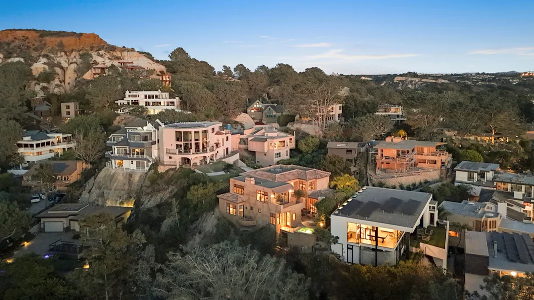 Tucked into the hills of Del Mar Terrace with views of the Pacific Ocean and the Torrey Pines Reserve is this masterfully built, modern Italian villa. Custom designed and constructed with extraordinary materials and workmanship, this home offers privacy and exudes quality. Complete with 4 bedroom suites, each with outdoor access, a sound proof gym, wine cellar, elevator, 3 fireplaces, outdoor spa with ocean view, cook’s kitchen, walk-in pantry, primary retreat with 2 walk-in closets, and 3 car garage. Located minutes to the beaches and California surfing, the Village of Del Mar, hiking and golf at world class Torrey Pines, the Del Mar Race Track, shopping and dining, just 30 minutes to public and private airports, 3 universities and downtown San Diego. The best known secret in Del Mar is the neighborhood of Del Mar Terrace with its viby, eclectic charm offering exclusivity, luxury and privacy, a blend of cutting edge design, panoramic views and a lifestyle and community that values privacy and quiet, but remains close to nightlife, fine dining, entertainment and outdoor endeavors. Nothing compares.