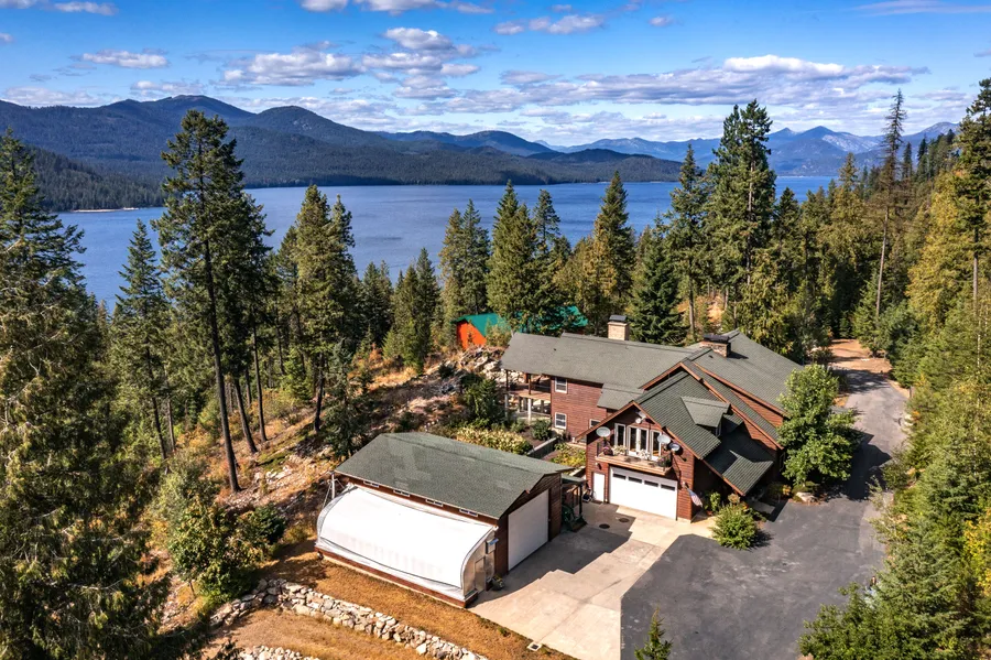 One-of-a-kind custom home on 13 acres (2 separate lots) overlooking the pristine waters of Priest Lake. This 4,738 sq. ft. home is surrounded by wilderness for ultimate privacy & natural beauty. Highlight of the upper level's open floor plan is a spectacular sun-filled great room w/ cathedral ceiling, natural stone fireplace, floor-to-ceiling windows & hand-scraped maple floor. Large deck for entertaining, relaxing & enjoying sweeping lake/mountain/forest view. Custom-built kitchen w/ knotty alder cabinets, granite countertops.Large dining room w/ wood-burning stove, lots of natural light. Two roomy bedrooms w/ ensuite baths, walk-in closets. Large office (or bdrm) w/ desks, conf table, built-in cabinets & shelves. Ground floor owner’s suite w/ stone fireplace, walk-in closet, large bath w/ double vanity, walk-in shower, jetted tub. Family room w/ unique wood-burning Tulikivi stove, custom cabinets. Convenient 2nd kitchen, dining/living area, 3 interior rooms that can be used for sleeping. Custom features & loads of storage throughout. Dumbwaiter for firewood & groc. Paved, tree-lined driveway. Whole-house propane generator & auto transfer switch. Well & gravity-fed water system. Intercom. 2 att garages; 24x36 shop w/att greenhouse & covered wood storage (2012); 30x50 storage bldg (2021); tiered garden area; water feature; chicken coop. Major remodel/home imprv (2008, 2021/22).