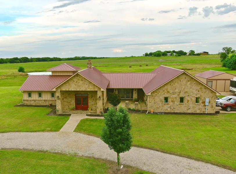 Sprawling 13.48 acres with three fishing ponds in Ellis County just 30 minutes from downtown Dallas. Located in the Palmer ISD, property would easily subdivide. Best described as Texas Tuscan, with modern conveniences. Sandstone and wood exterior with metal roof and foam insulation. Ample room to entertain, 12ft ceilings in living area with casement windows throughout, tile and wooden floors. Large stone fireplace separates Living and Dining area. Kitchen with a large island and wood cabinetry. Master suite features a spacious bedroom and bath, with huge walk-in closet. Extras include Metal Workshop and Kennel. Come take a Look!