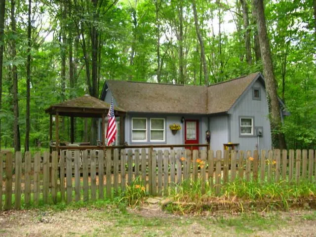 "Relaxation Station" Cute and cozy cabin on 13.61 acres. Overnight Tourist Rental for up to 4 guests. Paneled wood vaulted ceiling in living room; wood burning fireplace; atrium door to deck. Bedroom also has a cathedral ceiling. Utility room with washer & dryer. L-shaped deck with gazebo sitting area includes hot tub. Campfire area for cool evenings, fenced yard area offers great pet potential. Trail down to the pond where you'll find a dock for fishin' or contemplatin'.
