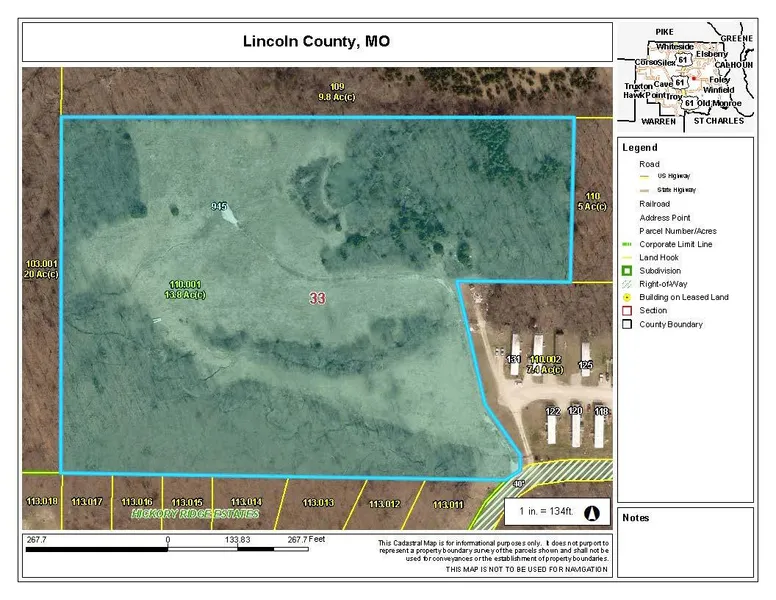 13.7 acres on Walker Road in unincorporated Lincoln County, MO. This tract is half open/half wooded. Located in public Water/Sewer District #1 with Sewer and Water at site. Ideal for Residential, Multifamily or Commercial Development. Unrestricted.