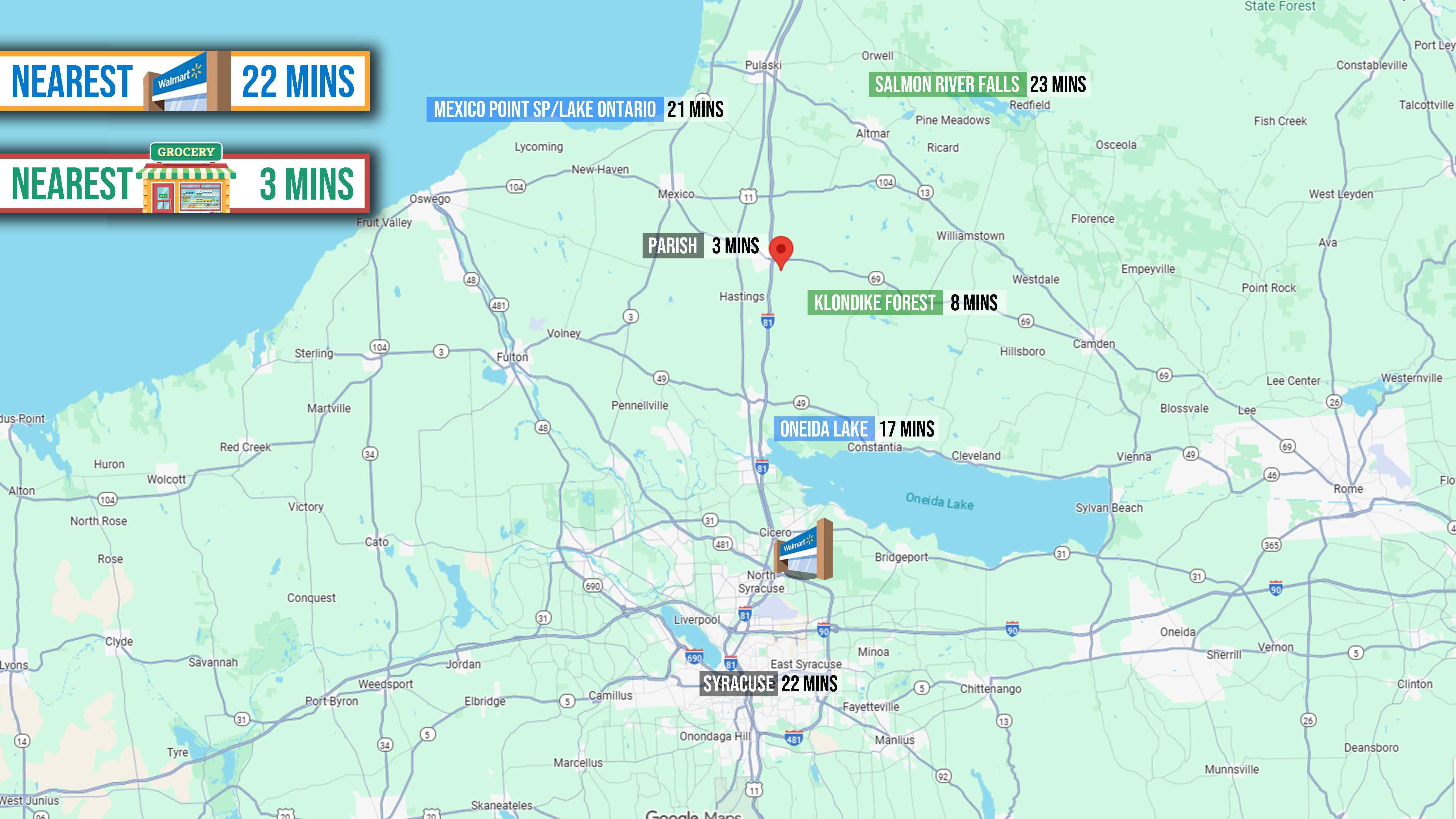 Located amidst the natural beauty of upstate New York near the shores of Lake Ontario (the easternmost of America’s Great Lakes), the area around Parish offers a plethora of recreational opportunities for outdoor enthusiasts. At the heart of these attractions is Klondike Wild Forest, a pristine expanse known for its extensive network of hiking trails that meander through dense woodlands and open meadows, offering a perfect retreat for nature lovers and bird watchers alike. Not far from Klondike, Salmon River Falls features a breathtaking 110-foot waterfall. This scenic spot is ideal for those seeking a tranquil space to picnic, sightsee, or delve into some adventurous hiking along the gorge. For everyday necessities, Parish is just a stone’s throw away, providing access to local groceries and essentials. Meanwhile, those in search of more extensive retail options can head to Syracuse, the nearest major city, where amenities like Walmart and a broader range of shopping and dining options await.