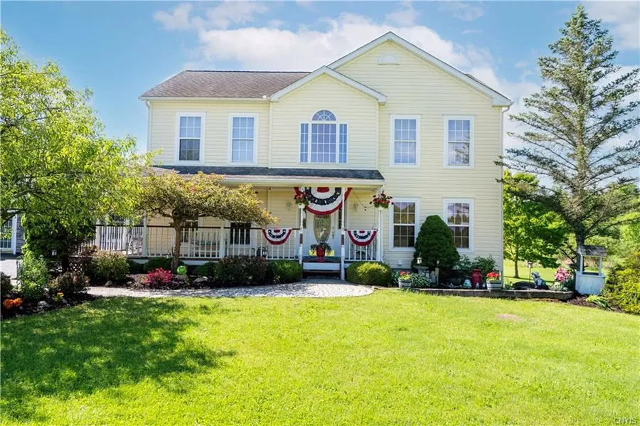 A picture perfect Colonial, set back in a country setting with nearly 14 acres in Cato, NY!! Close to Baldwinsville, Syracuse and Auburn. This home has all you will ever need. Head inside to the open floor concept where you will find a sitting area, family room, dining room and living room ready for your entertainment needs. Kitchen is prepped with new counter tops, flooring and stainless appliances. Also, on the first floor is an in-law suite/apartment equipped with a full bathroom, kitchen, living space and bedroom. Even use this for a guest or your business! Additionally, offered on the first floor is a dog kennel area that leads into a fenced in back yard. Heading upstairs you will find 2 newly carpeted bedrooms, a full bathroom, and a master with an ensuite bathroom. Central air and a full walk out basement included! Outside is really where the country beauty shines... a detached 2 car over sized bay garage (32x40) is met by your paved driveway. Out back is a pond along side a (20x50) pole barn equipped with water and electric. The gardens have been professionally landscaped every year! This is awaiting your rocking chairs on its front porch!!
