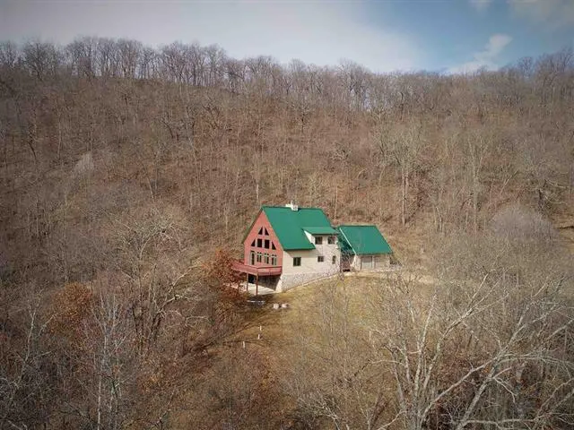 This generously sized Alpine style home tucked into the Kickapoo area hills has 13+/- wooded acres. Open area living, dining, and kitchen with maple floors welcome you to the main level where a towering stone fireplace faces a wall of windows overlooking the valley below. Main floor also consists of the master bedroom, full bath, laundry, and entry foyer. An upstairs loft leads to 2 more bedrooms, office, and full bath. The lower level with walkout has a large family room with wet bar, bathroom with shower, a workout room, storage and utility areas. Kayak, canoe, fish, hunt, hike here!