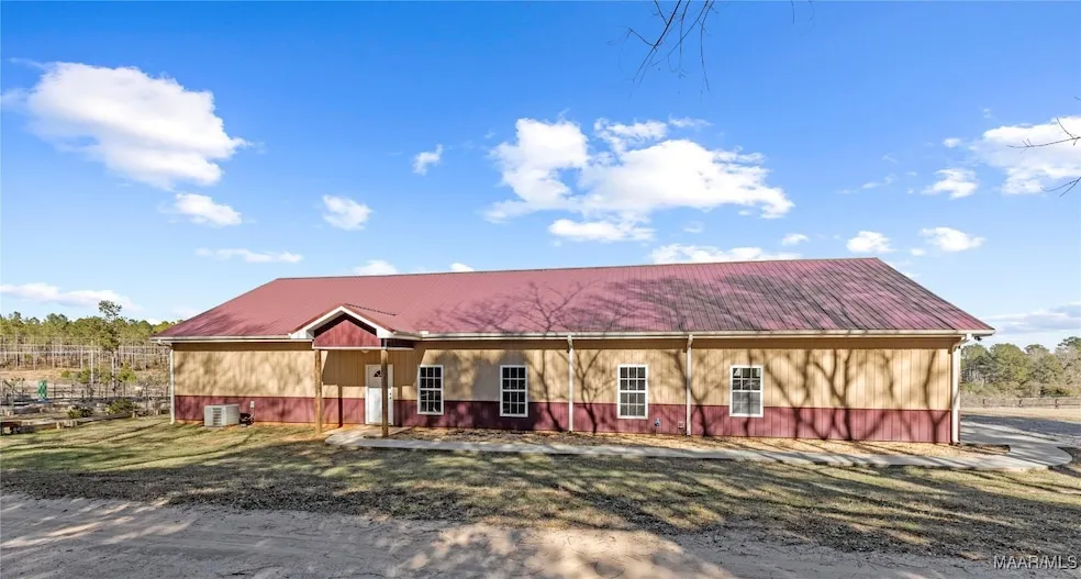 Welcome to your dream home, nestled on approximately 13 acres of seclusion in Daleville. This stunning barndo-style home, built in 2023, offers over 2200 sqft of open living space, perfect for those seeking seclusion without sacrificing modern comforts. Step inside to discover a beautifully designed 3-bedroom, 3-bathroom layout that flows effortlessly. The large kitchen, featuring a massive walk-in pantry, seamlessly transitions into the spacious living room ideal for both everyday living and entertaining. A standout feature of this home is the perfectly sized laundry room/mudroom, complete with abundant storage and like-new washer/dryer. The master suite is a true retreat, offering generous space and comfort, making it the perfect place to unwind. If you're looking for even more versatility, the 70x30 pole barn awaits, whether you need space for events, storage, or even horses. Outside, the property is an oasis, including a greenhouse and a charming chicken coop your very own slice of country living! This property is move-in ready and brimming with potential. Don't miss the chance to make this peaceful haven your forever home endless possibilities await!