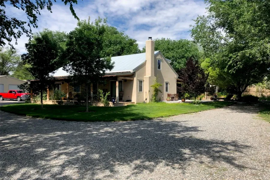 Rare Nambe horse property with water rights, mountain views and outbuildings. Situated on 1.389 irrigated & fenced acres, this 3 bedroom, 2 bath custom northern NM style home offers 2196 sq ft with vaulted pine ceilings, exposed vigas, solid ash hordwood floors & a spacious loft. Open living area features high-efficiency Acucraft wood-burning fireplace insert. Kitchen includes granite countertops, island, custom cabinetry with pull-out shelving, wine stoarge & quality appliances. Primary suite offers walk-in closets & spa-style bath with soaking tub. Private guest suite includes separate exterior entrance and en-suite bath. Outdoor living features flagstone portals, 16x20 Trex Deck, patio with fire pit, mature landscaping, fruit trees and a 12x20 greenhouse, a solar powered gate, RV trailer parking & horse trailer parking. Property includes deeded acequia water rights and a private well, fenced turnout, 30x35 three/four stall barn with tack room and hay storage, corral and 30x45 metal workshop with reinforced slab and electricity. Set against beautiful views of Sacred Heart Church, Santa Fe Ski Basin and Santa Fe Baldy, just minutes from Pojoaque and an easy drive to Santa Fe and Los Alamos.