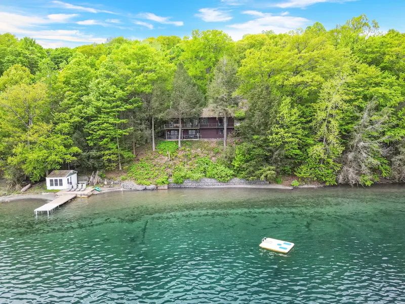 Skaneateles Lake gated year round vacation home with expansive 368 feet of private frontage, completely renovated and offered turnkey. Situated in a private Adirondack style paradise, this spectacular property, is within 17 min of the village of Skaneateles (voted 1 of America’s Best Small Towns to Visit) and the many shops, restaurants & activities it has to offer. For buyers seeking luxurious seclusion; this well-appointed hideaway can be accessed 3 seasons; affording exceptional views from multiple decks, level waterfront including permanent dock, lakeside “boathouse”, and shale beach; 2 story 3 car garage & waterfall. This exquisite property features 2 full levels of living. The main floor hosts a pristine white kitchen opening to a Great room w/ fireplace and massive deck perfect for entertaining. Additionally, this level offers a primary suite w/ private waterside balcony, 2 more b...