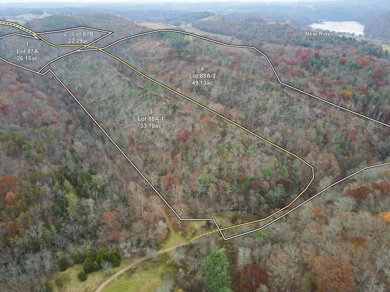 TRACT 2 (Lot 87B & Private Right of Way): 22.29 acres total (including entrance lane) with ridge top views and small interior stream.