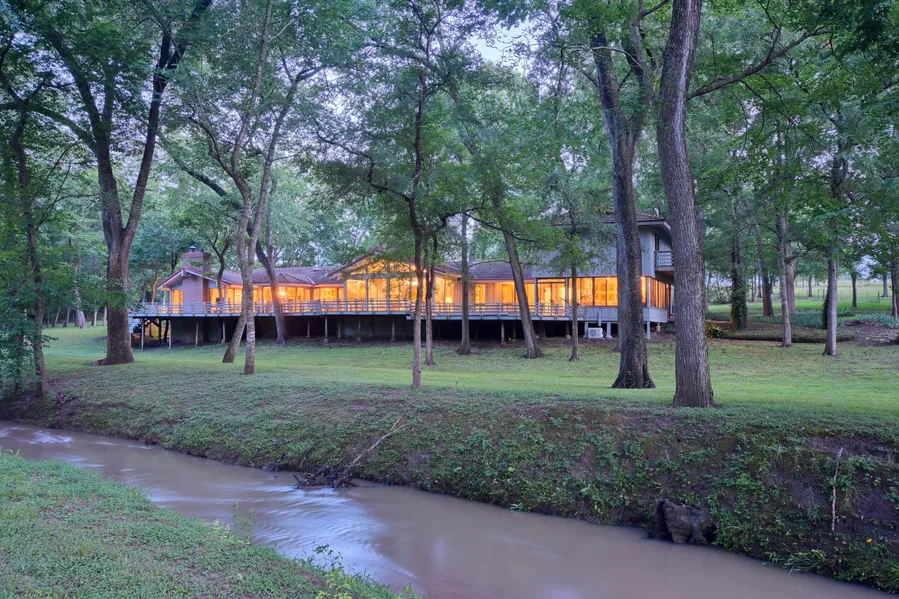Frank Lloyd Wright style classic architecture with every room opening to deck expanding the length of the home overlooking running creek and park like 10 acre wooded oasis.