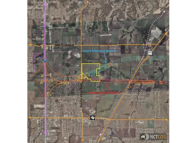Both Loop 9 alignment options bisect this property that will make it the future corner of Loop 9 and Houston School Road.