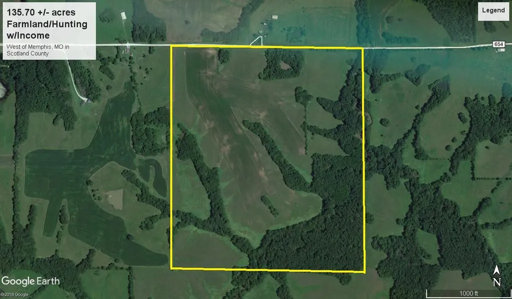 135.70 surveyed acres, west of Memphis, MO in Scotland County. FSA figures indicate approximately 79.51 cropland acres 22.27 currently in production. Adco, Armstrong, and Gara soils. Building site/recreation/tillable tract with utilities on site. Excellent hunting with income and mature timber and County Rd 654 access. Contact Jason Small for more information at 660-342-3819.*Property lines on the map are thought to be accurate but they are estimated.