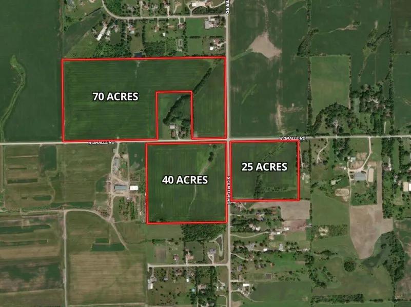 Opportunity to own one, two or three parcels at the corner of W. Dralle road and S. Center road. The farms are just north of Green Garden country club and south of Frankfort. The location has excellent long term development potential and is available at farmland pricing. 25 acres at the SE corner, 40 acres at the SW corner and 70 acres at the NW corner.