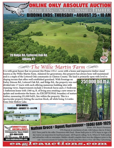 It is with great honor that we present this Prime 135+/- acres with a home and impressive timber stand known as the Willie Martin Farm. Admired for generations, this property has always been well maintained and is a staple of the Lettered Oak community in Clinton County. The land is primarily open with level to sloping terrain that offers well established grassland. With Frontage on Farley Stinson Rd., Letter Oak Rd., and Ridge Rd., the property was easily divided into 17 tracts with each offering numerous building sites with stunning views. Improvements include 2 livestock barns and a 3-bedroom 1-bathroom home with 1360 sq. ft. of living area awaiting a new owner to update and modernize the home. An Exceptional mature boundary of timber measuring over 250,000 bd. ft lies within the property. Ladies and gentlemen this is a spectacular property hitting the auction block, all while being 3.4 miles from Dale Hollow Lake.