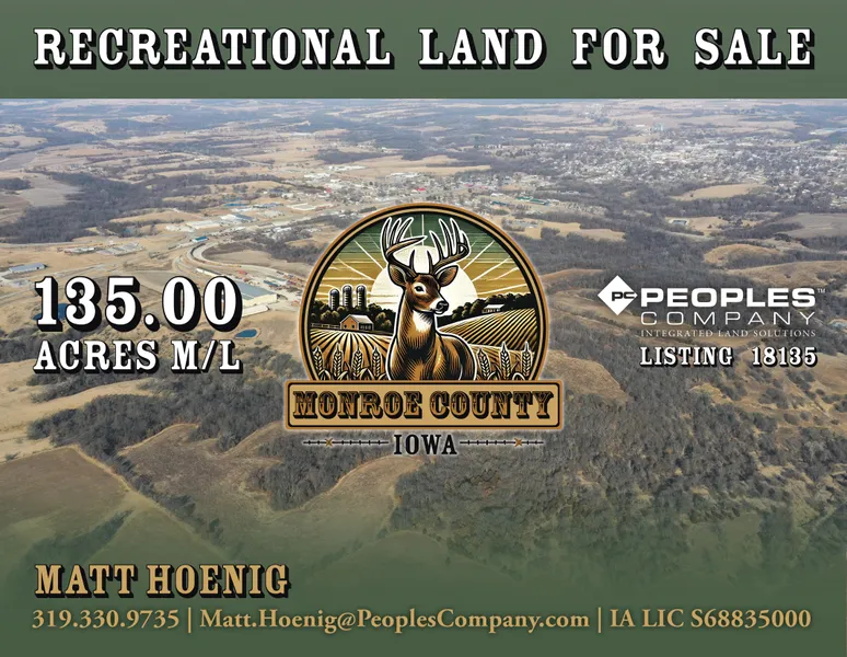 Premier Recreational Opportunity in the Heart of Trophy Whitetail Country. Peoples Company is pleased to present a rare opportunity to own 135 secluded acres in the renowned big-buck region of Monroe County, Iowa. Conveniently located just outside of Albia, this income-producing recreational farm offers world-class whitetail deer hunting, a thriving turkey population, and abundant upland bird opportunities. The Albia area is legendary among deer hunters, with a history of producing giant whitetails. This very farm also holds a small place in hunting historyits neighboring property is where the famous Tony Lovstuen Buck, better known as the Albia Buck, was harvested in 2003, scoring an incredible 300 inches with 38 scoreable points.