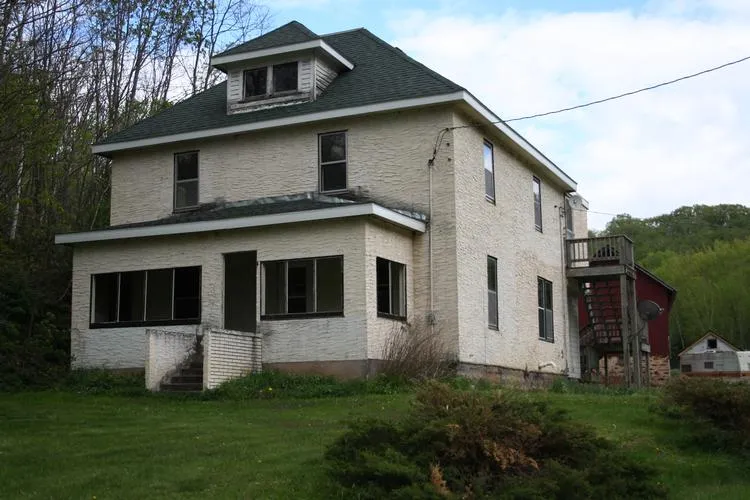 This property is at a secluded dead end, excellent hunting all around. The buildings are located in the center with a town road access. There is a 2- story Duplex stucco house. The main floor has the open concept with kitchen, linoeleum flooring, DR, LR, 2 big BR - all carpeted with closets, laundry with tile, 3/4 BA that has been redone, tile floors.