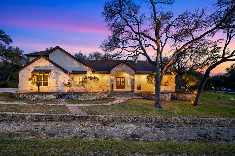 Situated on an impressive corner lot with great curb appeal, this exquisitely designed estate within River Crossing boasts a seamless, flowing layout tailored for a luxurious and comfortable lifestyle. The home's tremendous quality is evident in details such as stained concrete floors, custom ceiling details, upgraded light fixtures, and a gourmet kitchen with ample custom Alder Wood cabinetry, granite island/countertops, steel appliances, and gas cooking. It opens to a family room adorned with a stacked stone, floor-to-ceiling fireplace and wood beam ceiling accents. The master retreat is a sanctuary, complete with patio access and a well-appointed bathroom with a large walk-in closet. A guest bedroom on the main level and two additional guest bedrooms are found upstairs. Outdoors, tranquility awaits with seamless indoor-outdoor living. A premier heated pool with a waterfall feature, spacious covered patio with extensive hard decking, gas grill, and a park-like setting provide the perfect backdrop for relaxation or entertainment. River Crossing stands out as a top-tier community for golf and river enthusiasts alike. River Crossing Country Club provides exclusive options for social and golf memberships. Within the River Crossing community, residents enjoy access to a private Guadalupe river park access—perfect for picnics, swimming, and kayaking. Additionally, the neighborhood boasts a sports court and a covered pavilion, offering ideal spots for gatherings.
