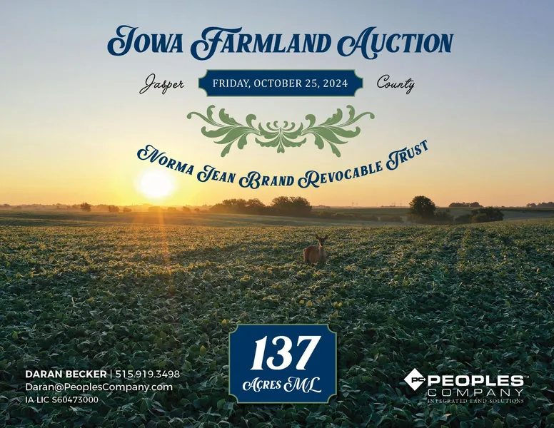 Jasper County, Iowa Farmland Auction Mark your calendar for Friday, October 25th, 2024 at 10:00 AM! Peoples Company is pleased to represent the Norma Jean Brand Revocable Trust in the sale of 137 total acres m/l of prime Jasper County, Iowa farmland.