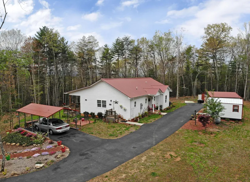 Cottage Classic! 1900+ sq ft, Impeccable 2BR/2.5BA quality home. This charmer offers a huge open great room boasting vaulted ceilings covered in tongue in groove. Collectible antique mantle adorns gas log fplc. Hardwood floors throughout the entire house - HYPO ALLERGENIC! Generous kitchen w/ center island and vegetable sink. Dining area seats 12+! Walk-in Pantry and Mud Rm. Guest BR has private BA, Master Suite accommodates King Sized furniture. Tiled Shower, antique double vanity. Bull-nosed sheetrock corners, one floor living. Workshop/garage, 1-car carport, multiple patios and 4.5+ Private wooded Acres with trees cleared around the house. 2x6 construction, Metal roof. Buyer may split property after purchase.