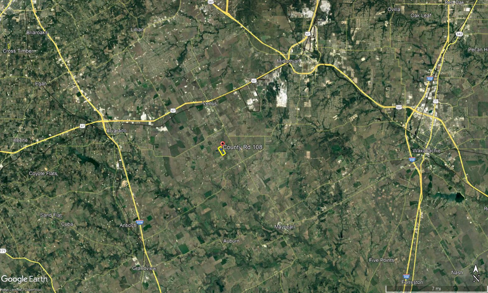 Located in the Midlothian ETJ in Johnson and Ellis counties with a quarter-mile of paved road frontage on County Road 108, this property has great potential. Approximately .75 miles west of FM 157 there is a 12" water line with fire hydrants present, this property is well suited for residential development use or long-term hold property. From the road, the property is level to the creek and gently slopes upward after the creek that winds through the property. Less than four miles separate you from the new Google data center, Midlothian business park, and the proposed extension of Highway 360 to Highway 67. Convenient access to areas like Dallas (40 minutes), Mansfield (25 minutes), and Fort Worth (40 minutes).
