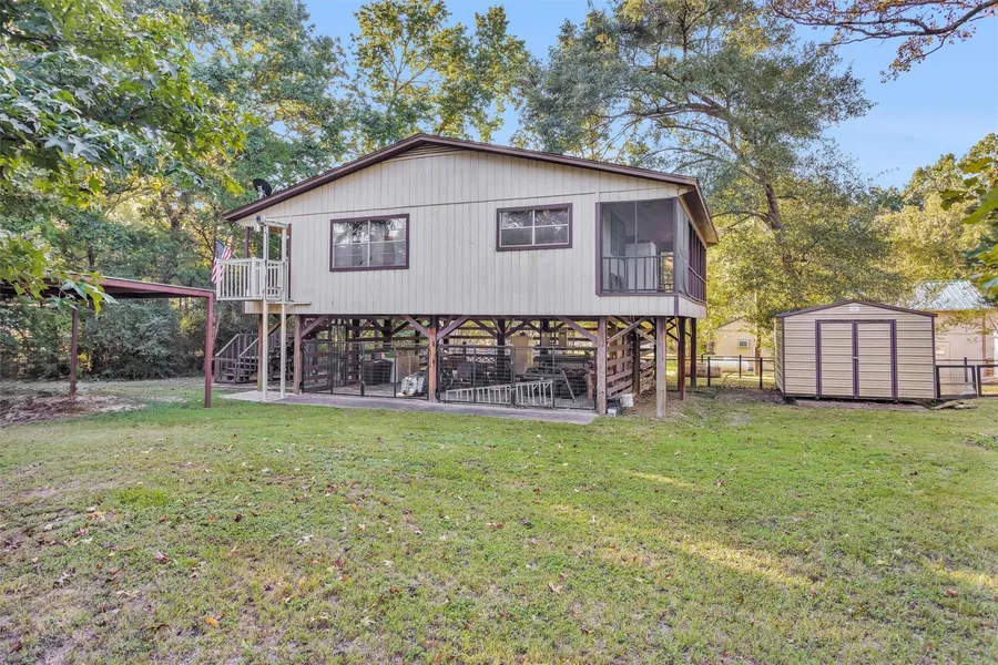 Check out this one of a kind home in the Lakewood community, located on Lake Livingston. This 3 bedroom, 2 bathroom home sits on stilts and has never been flooded. The first level offers so much potential and is equipped with power and closed in with fencing. There is a cargo lift/elevator or stairs that can take you to the main home level. You are welcomed with a large covered patio in the front and another covered and screened in patio in the back that is tranquil and perfect for relaxing. Inside, the open concept floor plan makes for easy living. The primary bedroom offers an en-suite bathroom. All rooms are spacious with newly installed carpet. Updates include Generac Generator, PEX waterline, new ductwork, on demand tankless water heater, metal fencing. The storage building sits on a 12x16 slab and provides extra storage. Washer, dryer, refrigerator stay. Community offers gated entry, boat ramp, and picnic area. Come see what Lakewood has to offer! Low taxes!