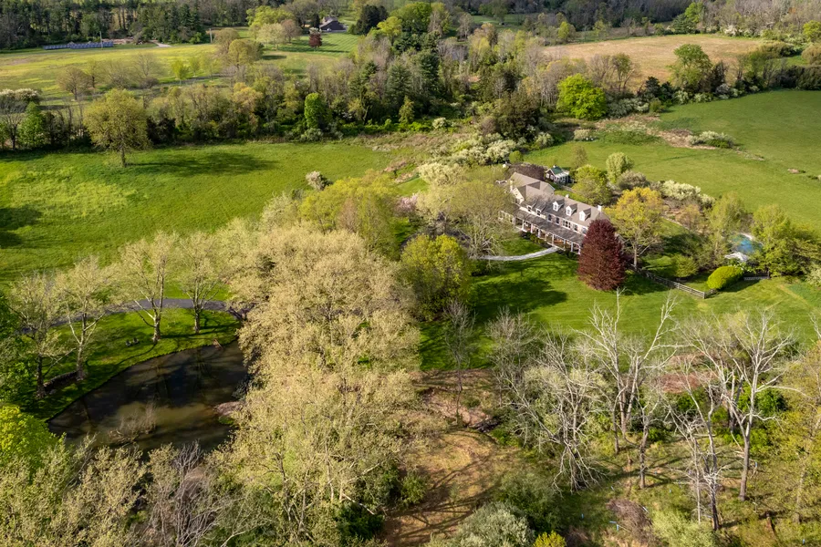 Upon arrival at this exquisite Bucks County-inspired residence, you will be greeted with breathtaking views of the expansive 14+ farm-assessed acres surrounding it. The property boasts a deck, patio, free-form pool, and pavilion, providing the ideal setting for hosting summer gatherings. The home's central hall leads to the dining, living, and library/study areas, all of which are connected by luxurious wide board wood floors. Relax by the see-through fireplace here or bask in the warmth of the fireplace in the open-concept family room, complete with a large breakfast room and the elevated, mission-style kitchen. Adjacent to the family room is a den with yet another fireplace. The main-level bedroom with an en-suite bathroom is perfect for live-in assistance or long-term guests. Upstairs, the primary suite offers a fabulous retreat with a gym/bonus room, spa-like bath with a soaking tub and a sauna, and two enormous dressing closets with custom inserts. Each of the other three second-floor bedrooms has its own bathroom, making mornings a breeze. Straight stairs lead to a handy attic for storage and the basement has even more including accommodation for your wine collection. In addition to the pool and pond, the grounds feature fenced vegetable gardens and stunning vistas from both the backyard and the long-covered front porch.
