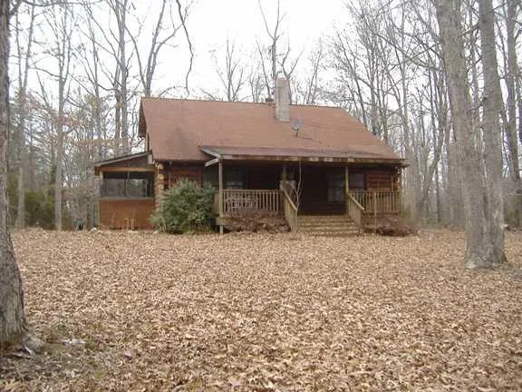Log cabin hidden in the woods with Meherrin River frontage; a great place to live, hunt, or use as a weekend getaway; no flooring in bedrooms; huge 33' x 13' family room with ceiling that soars to second floor; first floor has kitchen, family room, laundry room, 1/2 bath and office, second floor has 2 bedrooms and full bath; long road frontage on paved road and no close neighbors